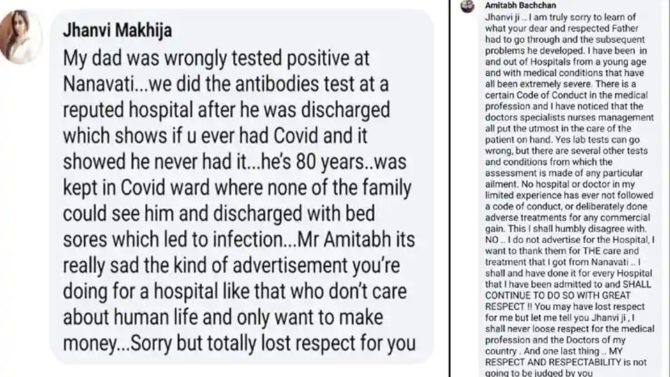 नानावटी रुग्णालयात माझ्या वडिलांचा चुकीचा रिपोर्ट देण्यात आला होता. त्यांची करोना चाचणी पॉझिटीव्ह दाखवण्यात आली होती. ते ८० वर्षांचे आहेत. त्यांचा करोना रिपोर्ट पॉझिटीव्ह दाखल्यामुळे त्यांना करोना रुग्णांमध्ये ठेवण्यात आले. नंतर त्यांना घरी सोडण्यात आले. पण अमिताभ तुम्ही अशा हॉस्पिटलची जाहिरात करत आहात हे पाहून वाईट वाटले. जे हॉस्पिटल लोकांच्या आयुष्याची परवाह करत नाही आणि केवळ पैसे कमावत आहे. मला माफ करा, पण आता तुमच्या बद्दलचा आदर राहिला नाही’ या आशयाची पोस्ट करत त्या महिलेनी बिग बींवर टीका केली.