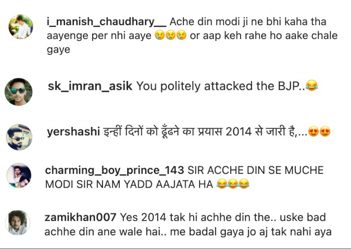 अमिताभ यांचा हा फोटो व्हायरल झाल्यानंतर नेटकऱ्यांनी त्यांच्या कॅप्शनचा संबंध मोदी यांच्याशी लावला आहे. एक नेटकरी म्हणाला, “अच्छे दिन येणार असं मोदी सुद्धा म्हणाले होते, पण नाही आले…आणि तुम्ही बोलत आहात की अच्छे दिन चले गए.” दुसरा नेटकरी म्हणाला, “तुम्ही नकळत बिजेपीवर निशाना साधला आहे.” तिसरा नेटकरी म्हणाला, “२०१४ पासून याचा दिवसांचा शोध सुरु आहे.” आणखी एक नेटकरी म्हणाला, “सर अच्छे दिन म्हटलं की मला मोदी आठवतात.”