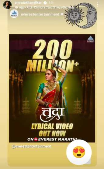 “प्रेक्षकांवर मोहिनी घालणाऱ्या चंद्रा गाण्याला यूट्यूबवर २०० मिलियन व्ह्यूज” अशी पोस्ट शेअर करीत एव्हरेस्ट मराठीने गाण्यासी संबंधित सर्वांना टॅग केले आहे. तसेच मूळ गाण्याला २०० मिलियन ह्यूज मिळाल्याने चित्रपटाच्या टीमने ‘चंद्रा’ गाण्याचा ‘लिरिकल व्हिडीओ’ प्रदर्शित केला आहे. यावर अमृताने “मी कायम ऋणी आहे…” अशी कमेंट केली आहे.