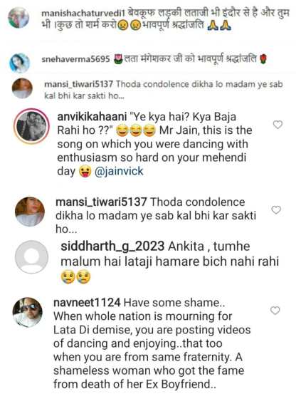 अंकिताचा हा व्हिडीओ पाहिल्यानंतर नेटकऱ्यांनी तिला ट्रोल केले आहे. एक नेटकरी म्हणाला, “जरा लाज बाळग. एकीकडे लतादीदींच्या निधनावर संपूर्ण देश शोक करत आहे, दुसरीकडे तुम्ही नाचत आहात आणि आनंद लुटतानाचा हा व्हिडिओ पोस्ट करत आहात. एवढंच काय तर तुम्ही एकाच चित्रपटसृष्टीतून असताना. एक निर्लज्ज स्त्री जिला तिच्या एक्स बॉयफ्रेंडच्या मृत्यूमुळे लोकप्रियता मिळाली.” दुसरा नेटकरी म्हणाला, “लतादीदींना भावपूर्ण श्रद्धांजली.” तिसरा नेटकरी म्हणाला, “त्यांच्या दुखात शामिल तरी हो हे काय कधीही करू शकते.” आणखी एक नेटकरी म्हणाला, “मुर्ख स्त्री लतादीदी सुद्धा इंदौरच्या होत्या आणि तू सुद्धा. थोडी तरी लाज बाळग. भावपूर्ण श्रद्धांजली”, अशा अनेक कमेंट करत नेटकऱ्यांनी अंकिताला ट्रोल केले आहे.
