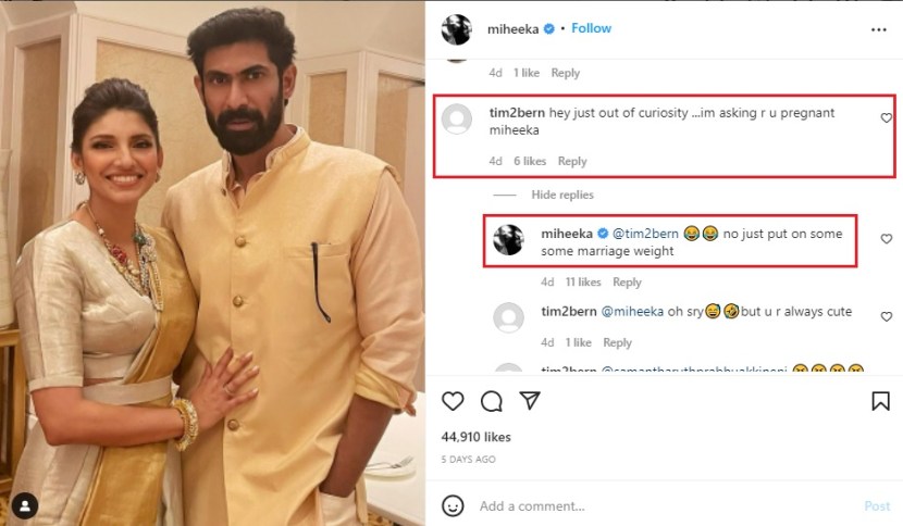 काही दिवसांपूर्वीच मिहिकानं तिच्या इन्स्टाग्रामवर पती राणा डग्गुबतीसोबत एक फोटो शेअर केला होता. दोघांनी कुणाच्या तरी लग्नाला हजेरी लावली होती आणि त्या लग्नातील हा या दोघांचा फोटो सोशल मीडियावर चर्चेत आला होता. या फोटोमध्ये मिहिकाचं वाढलेलं वजन पाहून अनेकांनी ती प्रेग्नन्ट असल्याचं म्हटलं होतं. राणा डग्गुबती लवकरच बाबा होणार अशा चर्चा सोशल मीडियावर सुरू झाल्या होत्या. यावर आता मिहिकानं प्रतिक्रिया दिली आहे.