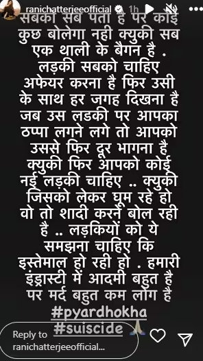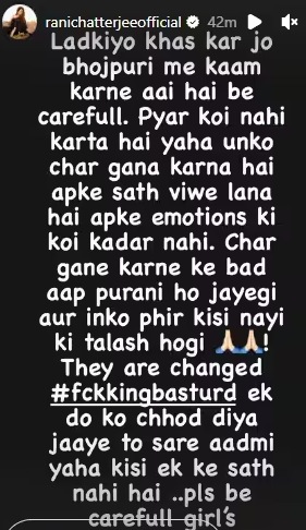 राणी चॅटर्जीने तिच्या इंस्टाग्राम अकाउंटवर एक स्टोरी पोस्ट केली आहे. अभिनेत्रीने या पोस्टद्वारे भोजपुरी इंडस्ट्रीचा खुलासा केला आहे. राणीने लिहिले की, ‘प्रत्येकाला सगळं माहिती आहे, परंतु कोणीही काहीही बोलणार नाही प्रत्येकाला मुलगी हवी आहे, प्रेमसंबंध हवे आहे, तिच्यासोबत फिरायला जायचे आहे. मात्र, जेव्हा त्या मुलीबरोबर तुमचं नाव जोडलं जातं. तेव्हा मात्र, तुम्हाला तिच्यापासून लांब पळायचे असतं कारण तुम्हाला नवी मुलगी हवी असते. ज्या मुलीला आपण घेऊन फिरत असतो तिची लग्न करण्याची इच्छा असते. मुलींना हे समजणे गरजेचे आहे की त्यांचा फक्त वापर केला जातो. आमच्या इंडस्ट्रीत माणसं भरपूर आहेत पण खरे पुरुष कमी आहेत.