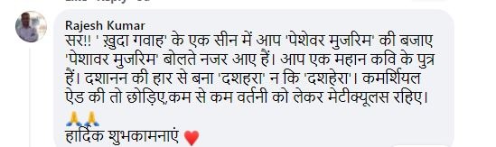 पटनातील तरुण राजेश पांडेने फेसबुकवर बिग बींनी केलेल्या एका पोस्टवर कमेंट करत त्यांना चूक लक्षात आणून दिली. बिग बी आणि या तरुणातील चॅट आता चांगलच व्हायरल होवू लागलं आहे. या तरुणाने बिग बींना त्यांनी दसऱ्याला दिलेल्या शुभेच्छामंध्ये चूक दाखवून दिलीय. ‘दशहरा’ आणि ‘पेशेवर’ हे दोन शब्द अशुद्ध लिहिले असल्याचं त्याने कमेंटमध्ये सांगितलं. बिग बींनी ‘दशहरा’ लिहिण्याएवजी ‘दशहेरा’ लिहिलं होतं. तसचं राजेशने बिंग बींच्या एका जुन्या सिनेमातील डायलॉगमध्ये देखील चूक होती हे निदर्शनास आणून दिलं. ”खुदा गवाह” या सिनेमात बिंग बींनी ‘पेशेवर मुजरिम’ म्हणण्याएवजी ‘पेशावर मुजरिम’ म्हंटलं होतं असे त्याने ध्यानात आणून दिलं.