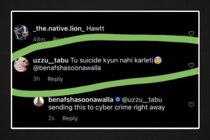 एका युझरने बेनाफ्साला तू आत्महत्या का करत नाहीस? असा प्रश्न विचारला होता. हा प्रश्न पाहून अभिनेत्री संतापली. “जगभरातील लोक सध्या करोनामुळे त्रस्त आहेत. लोक मानसिक आजारांशी लढत आहेत. गरीब व्यक्ती बेरोजगार झाला आहे. आणि तू काय विचारतोय? असे प्रश्न विचारण्यापूर्वी जरा एकदा विचार कर.” अशा आशयाची पोस्ट लिहून बेनाफ्साने त्याला प्रत्युत्तर दिले. तसेच आपल्या पोस्टमध्ये तिने सायबर पोलिसांना देखील टॅग केले आहे. बेनाफ्साची ही पोस्ट सध्या सोशल मीडियावर सर्वांचेच लक्ष वेधून घेत आहे.