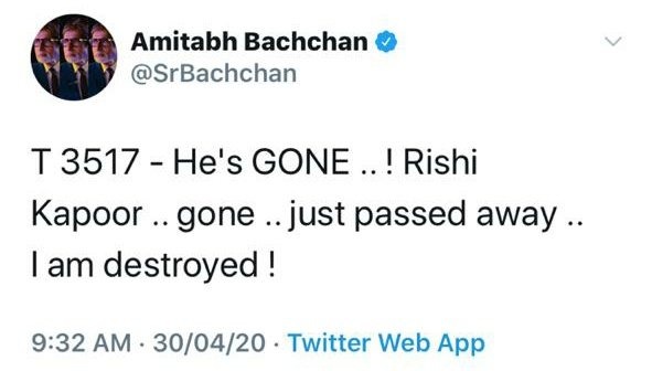 अमिताभ बच्चन यांनी ऋषी कपूर यांच्या निधनाची माहिती देताना म्हटलं होतं की, “ते गेले… ऋषी कपूर गेले….त्यांचं निधन झालं….मी उद्ध्वस्त झालो आहे”.