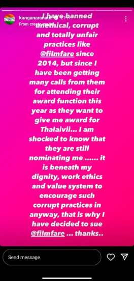 कंगनाने इन्स्टा स्टोरीमध्ये सांगितले की, तिने २०१४ पासून फिल्मफेअरवर बंदी घातली आहे. हा सोहळा अनैतिक, भ्रष्ट आणि पूर्णपणे अन्यायकारक असल्याचे तिने म्हटले आणि ती याचा भाग होणार नसल्याचे सांगितले. कंगनाने सांगितले की, तिला यावर्षी फिल्मफेअर पुरस्कार सोहळ्याला उपस्थित राहण्यासाठी अनेक फोन येत आहेत, कारण त्यांना ‘थलायवी’साठी हा पुरस्कार द्यायचा आहे. ती पुढे म्हणाली ‘ते अजूनही मला नामांकन देत आहेत, हे जाणून मला धक्का बसला आहे. अशा भ्रष्ट प्रथांना कोणत्याही प्रकारे प्रोत्साहन देणे हे माझ्या प्रतिष्ठेच्या, कार्य नैतिकतेच्या विरुद्ध आहे. म्हणूनच मी फिल्मफेअरवर केस करण्याचा निर्णय घेतला आहे’.