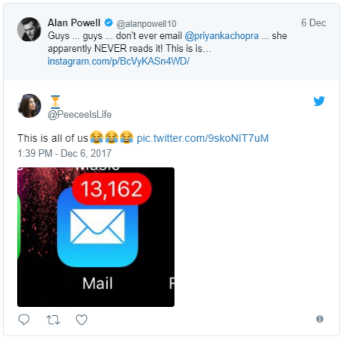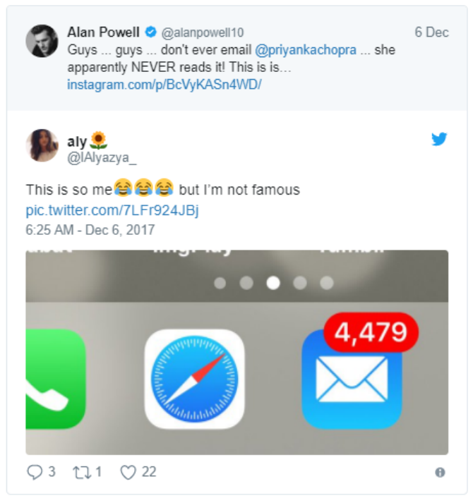 अॅलनने हा फोटो सोशल मीडियावर पोस्ट करताच अनेकांनी या फोटोशी स्वत:चा संदर्भ जोडण्याचा प्रयत्न केला. सतत येणारे ई-मेल आणि मेसेजेस बऱ्याचदा आम्हीही वाचत नाही असेच अनेकांनी स्पष्ट केले. अॅलेनच्या ट्विटला उत्तर देणाऱ्यांमध्ये प्रियाकाच्या चाहत्यांचा सहभाग जास्त असल्याचे पाहायला मिळाले असून, सोशल मीडियावर न वाचलेल्या ई-मेलचा हा किस्सा बराच गाजला.