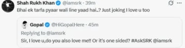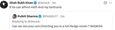 आणखी एका नेटकऱ्याने विचारले की, सर माझे तुमच्यावर प्रेम आहे, तुमचे माझ्यावर प्रेम आहे का? की हे एकतर्फी प्रेम आहे. यावर अभिनेता म्हणाला, “एकतर्फी प्रेमाबद्दल ऐकले आहेस? विनोद करत आहे, आय लव्ह यू टू.” एकाने विचारले की तुमच्या मुलाने दिग्दर्शित केलेल्या चित्रपटात आम्ही तुम्हाला पाहू शकतो का? यावर अभिनेता म्हणाला, “जर त्याला मी परवडत असेल आणि तो माझे नखरे सहन करू शकत असेल, तर मी त्याच्या चित्रपटात दिसू शकतो.”