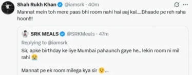 एका चाहत्याने शाहरुख खानला विचारले की, सर तुमच्या वाढदिवसासाठी आम्ही मुंबईत आलो आहोत, पण आम्हाल रूम मिळत नाहीये; मन्नतमध्ये रूम मिळेल का? यावर शाहरुख म्हणाला, “आजकाल मन्नतमध्ये माझ्यासाठीदेखील रूम नाही, भाड्याने रहात आहे.”
