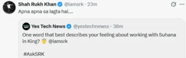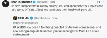 किंग चित्रपटात सुहानाबरोबर काम करताना काय वाटते? यावर अभिनेता म्हणाला, “आपलेसे वाटते.” एकाने विचारले की मुलांबरोबर काम करताना काय भावना असतात? यावर अभिनेता म्हणाला, “सेटवर असताना मी इतर सहकलाकारांप्रमाणेच त्यांचा आदर करतो. त्यांच्या कामाचे, मेहनतीचे कौतक करतो. सेटवर नसताना इतकीच प्रार्थना करतो की त्यांच्या मेहनतीचे त्यांना फळ मिळू दे.”