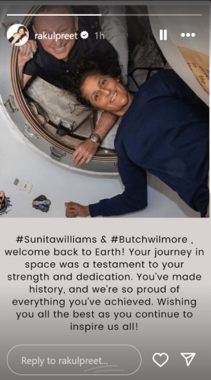 याबरोबरच अभिनेत्री रकुल प्रीत सिंगने इन्स्टाग्रामवर सुनीता विल्सम्स व बुच विल्मोर यांचा अंतराळातील एक फोटो शेअर केला. त्या फोटोखाली सुनीता विल्यम्स व बुच विल्मोर यांना टॅग करीत लिहिले, “अंतराळातील तुमचा प्रवास हा तुमच्या शक्ती व समर्पणाची परीक्षा होती, तुम्ही इतिहास निर्माण केला आहे. तुम्ही जे मिळवलं आहे, त्यावर आम्हाला अभिमान आहे. तुम्ही आम्हाला असेच प्रेरित करत राहण्यासाठी तुम्हाला खूप शुभेच्छा”, असे लिहित अभिनेत्रीने तिच्या भावना व्यक्त केल्या आहेत.