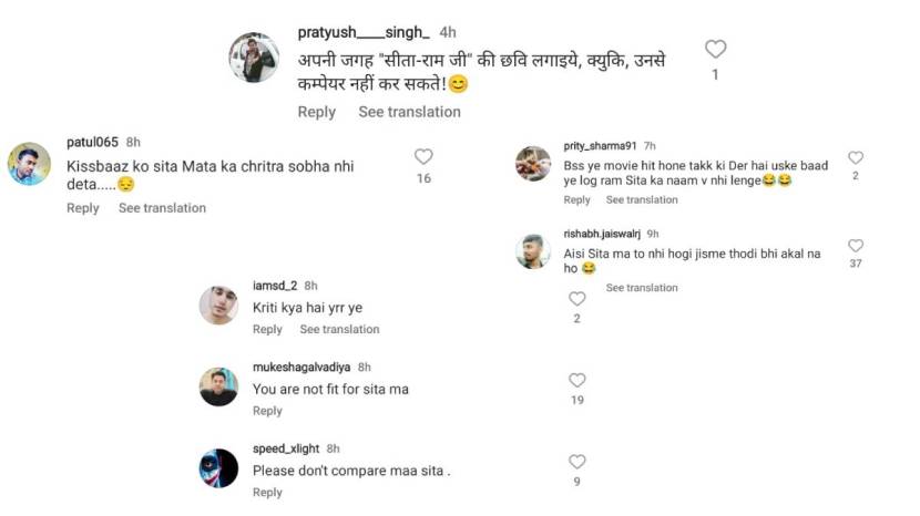 अभिनेत्री क्रिती सेनॉनच्या फोटोवर कमेंट करीत एका युजरने लिहिले की, “सीता माता महान आहे तिचे पात्र तुला शोभत सुद्धा नाही”, तर दुसऱ्या एका युजरने लिहिले आहे “रामायणातील पाच श्लोक सुद्धा तुला येत नसतील.” दरम्यान, क्रितीने इन्स्टाग्रामवर दोन फोटो शेअर केले आहेत. यातील पहिल्या फोटोमध्ये क्रितीने चित्रपटात साकारलेल्या सीतेच्या भूमिकेतील फोटो शेअर केला आहे आणि दुसरा फोटो तिच्या आईचा आहे.