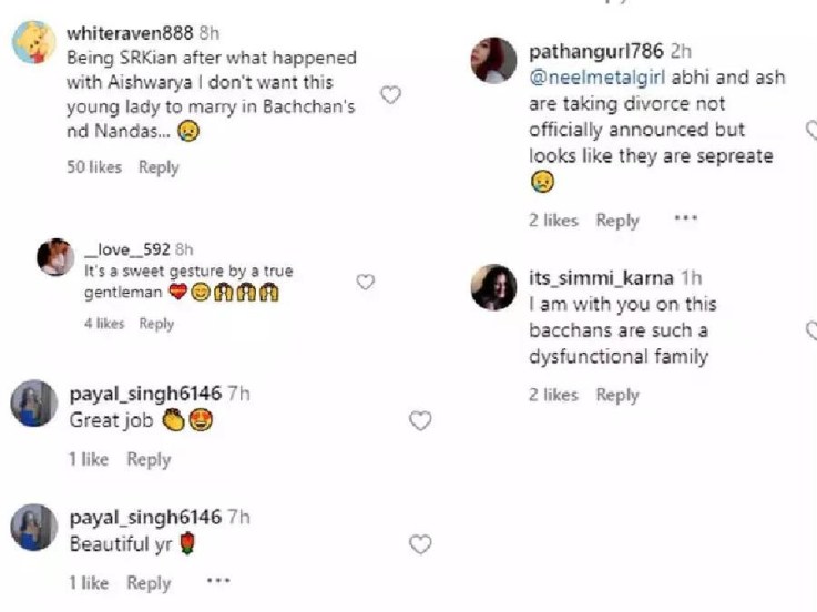 एका नेटकऱ्याने लिहिलं आहे, “ऐश्वर्याबरोबर जे झालं आहे ते पाहून असं वाटतं की, सुहानाने बच्चन किंवा नंदा कुटुंबात लग्न नाही केलं पाहिजे.” तसंच दुसऱ्या चाहत्याने लिहिलं, “याच्यापासून दूर राहा.” तर काही जणांनी अगस्त्यचं कौतुक केलं आहे.