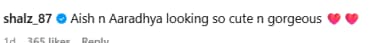 आता हा व्हिडीओ पाहिल्यानंतर अनेक नेटकऱ्यांनी आई आणि मुलीच्या जोडीचे कौतुक केले आहे. एका नेटकऱ्याने लिहिले, “आराध्या व ऐश्वर्या खूप क्यूट दिसतात.” दुसऱ्या एका नेटकऱ्याने लिहिले, “आराध्या खूप क्यूट आहे. किती लक्ष देऊन बघत आहे.” आणखी एका नेटकऱ्याने लिहिले,”ती क्यूट आहे.” एकाने लिहिले, “ती किती निरागस आहे.” दुसऱ्याने लिहिले, “मी तर आराध्यालाच बघत आहे.” आणखी एका नेटकऱ्याने लिहिले, “जगातील सगळ्यात भाग्यवान मुलगी” अशा अनेकविध कमेंट्स केल्या गेल्या आहेत.