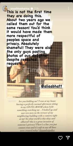 बॉलिवूड अभिनेत्री आलिया भट्टबरोबर एक खळबळजनक प्रकार घडला आहे. तिच्या घराच्या समोरच्या इमारतीवरील गच्चीवरुन गुपचूप फोटो काढणाऱ्यांवर तिने संताप व्यक्त केला आहे. यामुळे ती चर्चेत आली आहे. या घटनेनंतर बॉलिवूडमधील अनेक कलाकार हे आलियाला पाठिंबा देताना दिसत आहे. नुकतंच अभिनेत्री अनुष्का शर्माने याबद्दल पोस्ट शेअर केली आहे.
