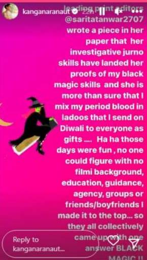 त्यामध्ये तिने म्हटलं की, ” २०१६मध्ये एका वृत्तपत्रकाच्या संपादकाने म्हटलं होतं की यश मिळवण्यासाठी मी काळी जादू करत आहे. माझ्या मासिक पाळीमधून होणारा रक्तस्त्राव लाडूमध्ये मी मिक्स केला आणि ते लाडू दिवाळी गिफ्ट म्हणून इतरांना दिले.” कंगनाच्या या पोस्टने सगळ्यांचं लक्ष वेधून घेतलं.