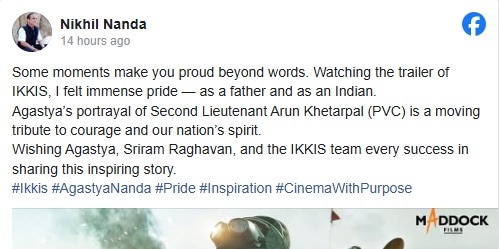 आजोबा अमिताभ यांनी कौतुक केल्यानंतर अगस्त्यचे वडील उद्योजक निखिल नंदा यांनीसुद्धा फेसबुकवर पोस्ट शेअर करत त्याचं कौतुक केलं. त्यांनी यामधून लिहिलं की, “काही गोष्टींमुळे तुम्हाला खूप अभिमान वाटतो. Ikkis चा ट्रेलर पाहून मला एका क्षणासाठी खूप अभिमान वाटला. एक वडील म्हणूनसुद्धा आणि एक भारतीय म्हणूनसुद्धा. अगस्त्य यामध्ये साकारत असलेली अरुण खेत्रपाल यांची भूमिका ही त्यांच्या कार्याला अभिवादन करणारी आहे. अगस्त्य तुला खूप सुभेच्छा.”