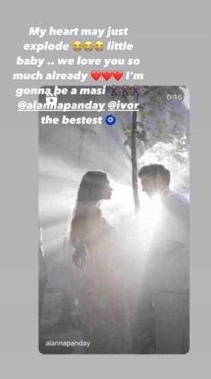अनन्या पांडेने इन्स्टाग्रामवर स्टोरीवर बहीण अलाना आई होणार असल्याची माहिती दिली. अलाना व तिच्या पतीचा सुंदर व्हिडीओ शेअर करत अनन्या म्हणाली की, “मी आता मावशी होणार आहे. बेबी, मी तुझ्यावर प्रेम करते.”