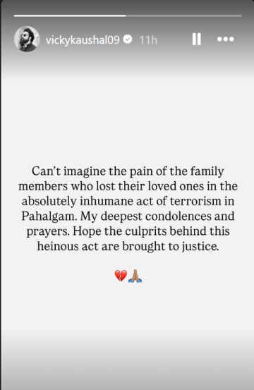 अभिनेत्री हीना खानने इन्स्टाग्राम स्टोरीवर “पहलगाम का?” असे लिहीत तिने भावना व्यक्त केल्या. तर बॉलीवूड अभिनेता विकी कौशलने त्याच्या इन्स्टाग्राम या दहशतवादी हल्ल्याबाबत लिहिले, “पहलगाममध्ये जो दहशतवादी हल्ला झाला, त्यामध्ये ज्या कुटुंबांनी त्यांच्या जवळच्या लोकांना गमावले; त्यांच्या दु:खाची कल्पनाही करू शकत नाही. त्यांच्यासाठी मनापासून प्रार्थना”, असे म्हणत अभिनेत्याने त्याच्या भावना व्यक्त केल्या आहेत. तर, सिद्धार्थ मल्होत्राने पहलगाममध्ये झालेला हल्ला हा भ्याड हल्ला असल्याचे म्हटले. मला आपल्या सैन्यावर पूर्ण विश्वास आहे. ते न्याय देतील. जे निरागस लोक या हल्ल्यात बळी पडले, त्यांच्यासाठी मी प्रार्थना करतो. जय हिंद! तर, अभिनेत्री जान्हवी कपूरने धक्का बसल्याचे म्हटले आहे.