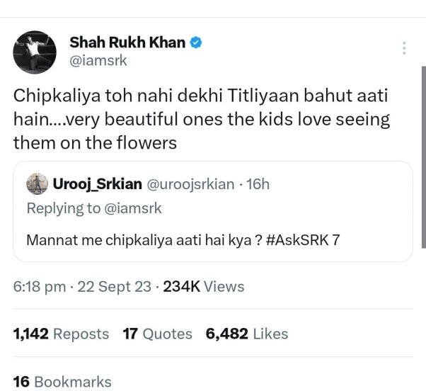 “‘मन्नत’मध्ये पाली येतात का?” असा प्रश्न शाहरुखच्या चाहत्याने त्याला विचारला. याला उत्तर देताना किंग खान म्हणाला, “आमच्या घरात पाली तर दिसल्या नाहीत पण, फुलपाखरं खूप येतात. फुलांवर बसलेली ही सुंदर फुलपाखरं पाहायला माझ्या मुलांना खूप आवडतं.”