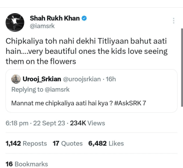 “‘मन्नत’मध्ये पाली येतात का?” असा प्रश्न शाहरुखच्या चाहत्याने त्याला विचारला. याला उत्तर देताना किंग खान म्हणाला, “आमच्या घरात पाली तर दिसल्या नाहीत पण, फुलपाखरं खूप येतात. फुलांवर बसलेली ही सुंदर फुलपाखरं पाहायला माझ्या मुलांना खूप आवडतं.”