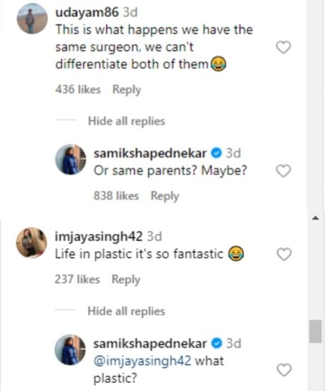 पेडणेकर बहिणींच्या या व्हिडीओवर एका नेटकऱ्यानं कमेंट करीत लिहिलं, “जेव्हा एकच सर्जन तुमची सर्जरी करतो, तेव्हा असं घडतं. आम्ही दोघांमधला फरक ओळखू शकत नाही.” “एकच सर्जन की एकच पालक? कदाचित?”, असं खणखणीत उत्तर समीक्षानं कमेंट करीत दिलं.