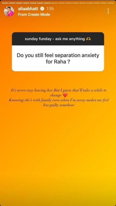 अभिनेत्री आलिया भट्टने इन्स्टाग्रामवरील ‘आस्क मी सेशन’द्वारे चाहत्यांशी गप्पा मारल्या. ज्यामध्ये चाहत्यांनी त्वचेच्या काळजीपासून ते राहापर्यंत अनेक प्रश्न विचारले. यावेळी एका चाहत्याने विचारले की, तुला अजूनही राहापासून जास्त वेळ वेगळं राहिल्यावर चिंता वाटते का? या प्रश्नाचं उत्तर देत आलिया म्हणाली, “राहापासून लांब राहणं हे माझ्यासाठी सोप नसतं. जेव्हा मी बाहेर असते तेव्हा मला जास्त चिंता किंवा काळजी करायची गरज नसते. कारण राहा आपल्या कुटुंबीयांबरोबर सुरक्षित आहे, हे मला माहित असतं.”