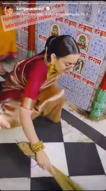 कंगनाने इन्स्टाग्राम स्टोरीवर हा व्हिडीओ शेअर केला आहे. ज्यामध्ये अभिनेत्री समाजसेवा करताना दिसत आहे. कंगना साडीतच एका हनुमात मंदिरात झाडू मारताना पाहायला मिळत आहे. हा व्हिडीओ शेअर करत कंगनाने लिहिलं आहे, “हनुमान मंदिरात सफाई केली. पण गर्दी जास्त झाली.” कंगनाचा या व्हिडीओने सध्या सगळ्यांचं लक्ष वेधून घेतलं आहे.