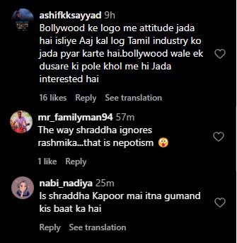 एका नेटकऱ्यानं लिहीलं आहे की, “बॉलीवूडमधील लोकांचा जास्त अहंकार आहे. त्यामुळे आजकाल लोक दाक्षिणात्य सिनेसृष्टीवर जास्त प्रेम करत आहेत. बॉलीवूडमधील लोकांना एकमेकांची पोलखोल करण्यात जास्त रस आहे.” तर दुसऱ्या नेटकऱ्यानं लिहीलं आहे की, “श्रद्धाने ज्याप्रकारे रश्मिकाला दुर्लक्ष केलं ते म्हणजे एकप्रकारे नेपोटिझम आहे.” तर तिसऱ्या नेटकऱ्यानं लिहीलं आहे की, “या श्रद्धा कपूरमध्ये एवढा अहंकार कसला आहे?”