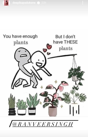 दीपिकाने शेअर केलेल्या मीममध्ये एक व्यक्ती झाडं खरेदी करत आहे आणि दुसरी व्यक्ती “आपल्याकडे खूप झाडं आहेत” असे म्हणत त्याला थांबवण्याचा प्रयत्न करताना दिसत आहे. हा मीम आपल्या इन्स्टाग्राम स्टोरीवर शेअर करत दीपिकाने रणवीर सिंहला टॅग केले आहे. आता यावर रणवीर काय प्रतिक्रिया देणार याबाबत चाहत्यांच्या मनात उत्सुकता निर्माण झाली आहे.
