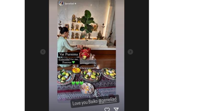 आपली पत्नी पूजा करत आहे हे पाहून रितेशलाही अगदी आनंद झाला. त्याने जिनिलीयाचा वडाच्या फांदीची पूजा करताना फोटो इन्स्टाग्रामद्वारे शेअर केला. हा फोटो शेअर करत त्यानेही जिनिलीयावरचं प्रेम व्यक्त केलं. तो म्हणाला, “लव्ह यु बायको”. अनेक फोटो व व्हिडीओंमधूनच रितेश व जिनिलीयाचं एकमेकांवर किती प्रेम आहे हे दिसून येतं.