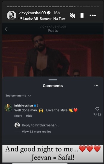 बॉलीवूड अभिनेता हृतिक रोशन आपल्या डान्सच्या कौशल्यासाठी ओळखला जातो. त्याला अनेकदा ग्रीक देवता, असेही संबोधले जाते. सोशल मीडियावर विकीने ‘तौबा तौबा’ गाणे शेअर केलेल्या पोस्टवर हृतिक रोशनने, “खूप सुंदर, तुझी शैली आवडली”, असे म्हटले आहे. आता हृतिकने कौतुक केल्यावर विकीला खूप आनंद झाल्याचे पाहायला मिळाले. हृतिकने केलेल्या कमेटचा स्क्रीनशॉट त्याने आपल्या स्टोरीवर शेअर केला आहे. हे करीत असताना विकीने म्हटले आहे की, ही रात्र मला म्हणत आहे, आयुष्य यशस्वी झाले. त्याबरोबरच त्याने आपली कृतज्ञता व्यक्त करताना पोस्टमध्ये हृदयाच्या इमोजीचासुद्धा वापर केला आहे.
