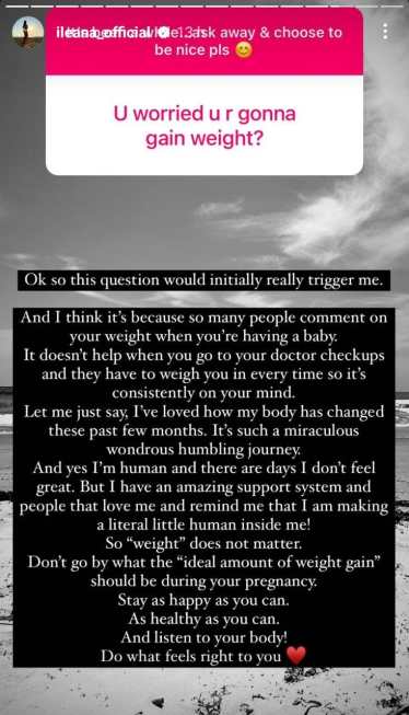 इलियानाने नुकतंच इन्स्टाग्रामवर आस्क मी एनिथिंग हे सेशन घेतलं. ह्यात एका चाहत्याने तिला विचारलं, “तुलाही वाढत्या वजनाचा त्रास जाणवत आहे का?” त्यावर सुरुवातीच्या दिवसांमध्ये वाढणाऱ्या वजनावरून ती त्रासली होती पण आता तिला काहीही फरक पडत नाही, असं ती म्हणाली. तिने लिहिलं, “जेव्हा तुम्ही बाळाला जन्म देणार असता तेव्हा अनेकजण तुमच्या वजनाबद्दल बोलतात. जेव्हा तुम्ही डॉक्टरांकडे तपासणीसाठी जातात तेव्हाही तुम्हाला याबाबतीत कोणतीही मदत मिळत नाही आणि सारखं वजन तपासावं लागतं. वाढत्या वजनाबद्दल सतत डोक्यात विचार येतो.”