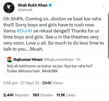 “शूटिंगमधून वेळ मिळाल्यामुळे आता थोडावेळ मी तुमच्याशी गप्पा मारतो” असं ट्वीट करत अभिनेत्याने आस्क एसआरके सेशनची सुरुवात केली. अशातच राजकुमार हिरानी ट्वीट करत म्हणाले, “सर, आता बाथरुममधून बाहेर या…काय करताय? प्रेक्षकांना ट्रेलर दाखवावा लागेल.”