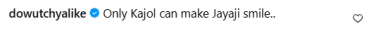 एका नेटकऱ्याने लिहिले, “जयाजी हसत आहेत. म्हणजे हे एआयने केलेले आहे”, दुसऱ्या एका नेटकऱ्याने लिहिले, “फक्त काजोलच जयाजींना हसवू शकते”, आणखी एका नेटकऱ्याने लिहिले, “हे हसणारे चेहरे खूप सुंदर दिसत आहेत”, अशा अनेक कमेंट्स पाहायला मिळत आहेत. तर अनेकांनी राणी आणि काजोल यांचे कौतुक केले आहेत. तर काहींनी अजय या पूजेला कधीच का येत नाही, तो कधीच का या दुर्गा पूजेत सहभागी होत नाही? अशा कमेंट करत त्यांना प्रश्न विचारले आहेत.