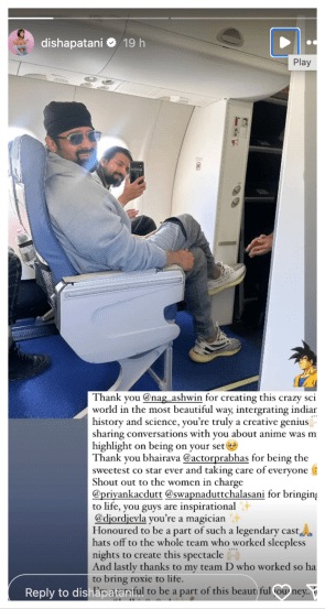 सोशल मीडियावर शेअर केलेल्या या पोस्टमध्ये दिशा म्हणते की, विज्ञान आणि भारतीय इतिहासाला इतक्या सुंदर पद्धतीने एकत्र आणून गोष्ट निर्माण केल्याबद्दल नाग अश्विन यांचे मी आभार मानते. सेटवर असताना तुमच्याबरोबर अॅनिमेशनविषयी संवाद साधणे ही माझ्यासाठी पर्वणी होती. सगळ्यांची काळजी घेतल्याबद्दल आणि सर्वांत चांगला सहकलाकार असल्याबद्दल भैरवाची अर्थात प्रभासचीदेखील मी आभारी आहे. त्याबरोबरच तेलुगू चित्रपट निर्मात्या प्रियांका दत्त आणि स्वप्ना दत्त यांच्याबद्दल दिशा लिहिते- तुम्ही या चित्रपटाला सत्यात उतरवले. तुम्ही प्रेरणादायी आहात. पुढे ती म्हणते की, अशा दिग्गज कलाकारांबरोबर काम करणे माझ्यासाठी अभिमान आणि सन्मानाची बाब आहे. ज्या कलाकारांनी ही कलाकृती सत्यात उतरवण्यासाठी रात्रीचा दिवस केला, त्यांना सलाम आहे. शेवटी, रॉक्सी या पत्राला जिवंत करण्यासाठी खूप मेहनत घेतलेल्या माझ्या टीम डीचे मनापासून कृतज्ञता व्यक्त करते. मला या सुंदर प्रवासाचा एक भाग बनविल्याबद्दल मी या चित्रपटाशी संबंधित सर्वांची आभारी आहे. हे लिहीत असताना दिशाने प्रभास आणि नाग अश्विन यांचा विमानातील फोटो शेअर केला आहे.