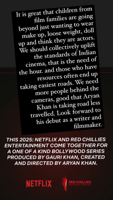 “आपण सर्वांनी एकत्र मिळून भारतीय सिनेसृष्टीचा दर्जा उंचावण्यासाठी काम केलं पाहिजे. कारण- ही आता काळाची गरज आहे. ज्यांच्याकडे मनोरंजन विश्वात येण्यासाठी सर्व मार्ग उपलब्ध असतात, ते शक्यतो सोपे मार्ग स्वीकारतात. मात्र, आर्यनने अभिनयाव्यतिरिक्त वेगळा मार्ग निवडला आहे. त्यानं जो मार्ग निवडला आहे, तो फार कमी व्यक्ती निवडतात. आपल्याला आता कॅमेऱ्यामागे चांगलं काम करणाऱ्या व्यक्तींची फार गरज आहे. आर्यनला लेखक आणि आणि चित्रपट निर्माता म्हणून पाहण्यासाठी मी फार उत्सुक आहे”, असं कंगनाने आपल्या स्टोरीमधून सांगितलं आहे.