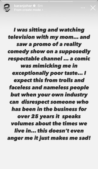 नुकतीच त्याने त्याच्या अधिकृत इन्स्टाग्राम अकाउंटवर एक स्टोरी शेअर केली आहे. ही स्टोरी सध्या चर्चेचा विषय ठरली आहे. एका प्रतिष्ठित वाहिनीवरील कॉमेडी शोने करणची नक्कल करत त्याचा अपमान केला आहे, याबद्दल त्याने आपलं मत मांडलं आहे.