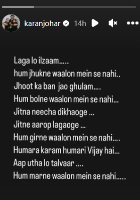 करण जोहर हा सोशल मीडियावर सक्रीय असतो. नुकतंच त्याने इन्स्टाग्रामवर एक स्टोरी पोस्ट केली आहे. यात त्याने एक शायरी पोस्ट केली आहे. याद्वारे त्याने त्याच्यावर टीका करण्यांना अप्रत्यक्षरित्या उत्तर दिल्याचे बोललं जात आहे.