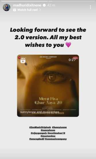 ‘मेरा पिया घर आया 2.0’ असं या नवीन गाण्याचं नाव आहे. तर या गाण्यात सनी लिओनी झळकणार आहे. या गाण्याचा एक टीझर नुकताच प्रदर्शित झाला. हा टीझर शेअर करत माधुरी दीक्षितने त्यावर प्रतिक्रिया दिली आहे. तिने तिच्या इन्स्टाग्राम स्टोरीवर हा टीझर शेअर करत लिहिलं, “या गाण्याचं नवीन व्हर्जन पाहण्याची मी वाट बघत आहे. तुम्हाला माझ्याकडून खूप शुभेच्छा.”