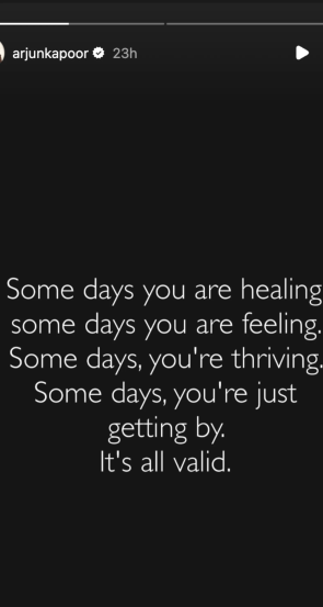 दरम्यान, अर्जुन कपूरचीदेखील एक इन्स्टाग्राम स्टोरी चर्चेत आली आहे. यामध्ये त्यानं लिहिले आहे, “काही दिवस तुम्ही ठीक असता, काही दिवस तुम्हाला छान वाटतं, काही दिवस आनंदी असल्यासारखं वाटतं, काही दिवस तुम्ही फक्त जगत आहात आणि सारं काही ओके आहे.”