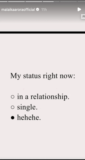 मलायका अरोराने तिच्या इन्स्टाग्राम अकाउंटवर एक स्टोरी पोस्ट केली आहे. यात तिने तिचं रिलेशनशिप स्टेटस सध्या काय आहे, याची माहिती सांगितली आहे. तिने शेअर केलेल्या पोस्टमध्ये “सध्याची माझी स्थिती काय”, असं लिहिलं आहे. त्यावर पुढे तीन पर्याय दिले आहेत. यात पहिला पर्याय ‘रिलेशनशिपमध्ये’ असा आहे. दुसरा पर्याय ‘सिंगल’ असा आहे, तर तिसऱ्या पर्यायासमोर ‘हेहेहे’, असं लिहिलं आहे. मलायकाने यातील तिसरा पर्याय हायलाईट केला आहे. तिने ही स्टोरी पोस्ट करत यावर अन्य कोणतीही माहिती लिहिलेली नाही.