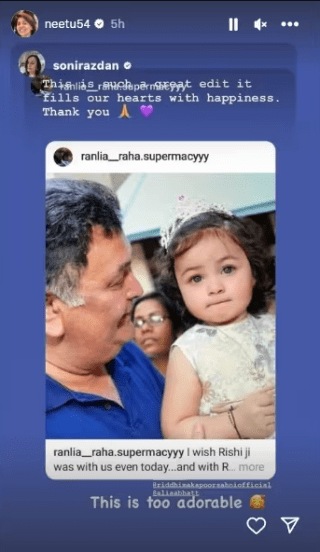 एवढेच नाही तर नीतू कपूर यांनीही तो फोटो आपल्या इन्स्टा स्टोरीवर शेअरही केला आहे. राहा व ऋषी कपूर यांचा फोटो बघून नीतू कपूर भावुक झाल्या. हा फोटो एडिट करणाऱ्या एडिटरचे त्यांनी कौतुकही केले आहे. त्यांनी पोस्टमध्ये लिहिले, “ही एवढी चांगली एडिटिंग आहे की, आम्हाला ते पाहून खूपच आनंद झाला… खूप खूप धन्यवाद…”