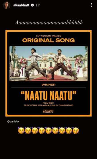 गेले अनेक महिने ‘RRR’ या चित्रपटातील नाटू नाटू या गाण्याकडे सर्वांचे लक्ष लागलं होतं. याचं कारण म्हणजे त्याला मिळालेला ऑस्कर नामांकन. आता या गाण्याला ऑस्कर मिळाला नाही सर्वत्र आनंद व्यक्त केला जात आहे. अभिनेत्री आलिया भट्टने देखील ‘RRR’ या चित्रपटात छोटीशी पण महत्त्वपूर्ण भूमिका साकारली. तिने इन्स्टाग्रामवर एक स्टोरी शेअर करत ‘नाटू नाटू’ गाण्याला ऑस्कर मिळाल्याबद्दल आनंद व्यक्त केला आहे.