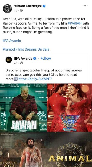 अभिनेता विक्रम चॅटर्जी या पोस्टमध्ये लिहितो की, “प्रिय आयफा, मी पूर्ण विनम्रतेने सांगू इच्छितो की, तुम्ही शेअर केलेले ‘अॅनिमल’चे पोस्टर माझ्या ‘पारिया’ चित्रपटाचे असून फक्त माझ्याजागी रणबीर कपूरचा चेहरा लावला गेला आहे. मी रणबीरचा खूप मोठा चाहता असल्याने मला काही फरक पडत नाही पण, यामुळे त्याला नक्कीच फरक पडेल.”