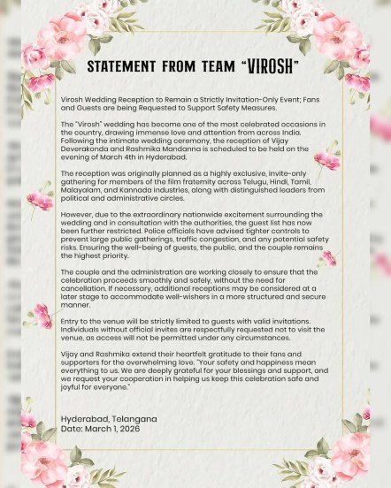 उदयपूरमध्ये लग्न केल्यानंतर रश्मिका व विजय देवदर्शन करण्यात व्यग्र आहेत. त्यानंतर या जोडीचं रिसेप्शनही पार पडणार आहे. ४ मार्चला हैदराबादमध्ये रश्मिका व विजयचं रिसेप्शन आहे. तमिळ, तेलुगू, कन्नड आणि हिंदी चित्रपटसृष्टीतील कलाकार या रिसेप्शनला हजेरी लावणार आहेत. यावेळी दोघांच्या रिसेप्शनला सामान्य माणसांना त्या दिवशी गर्दी आणि ट्रॉफिकमुळे कुठली समस्या होऊ नये म्हणून पोलिस अधिकाऱ्यांच्या सल्ल्यानुसार मोजक्याच लोकांना आमंत्रित करण्यात आलं असल्याचं विजय देवरकोंडाच्या टीमकडून कळवण्यात आलं आहे.