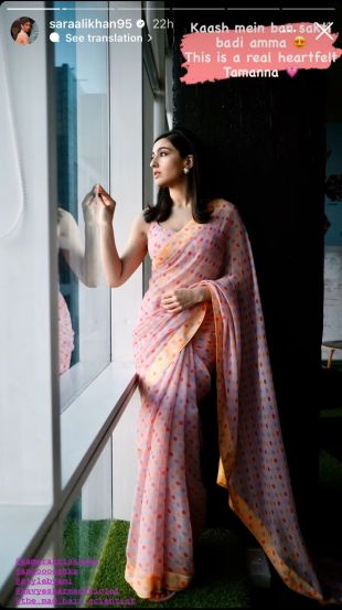 ज्येष्ठ अभिनेत्री शर्मिला टागोर यांच्या गाण्यासह साराने तिच्या रेट्रो लूकचे फोटो इन्स्टाग्राम स्टोरीवर शेअर केले आहेत. त्याला कॅप्शन देत साराने लिहिले, “काश मैं बन सकती बडी अम्मा धिस इज अ रिअर हार्टफेल्ट तमन्ना.” या रेट्रो लूकमधील व्हिडीओमध्ये शर्मिला टागोर यांची नात सारा त्यांच्या जुन्या चित्रपटातील भूमिकांप्रमाणे दिसत आहे. साराच्या या रीलवर नेटकऱ्यांनी कमेंट्स करीत, तिला “ज्युनियर शर्मिला”, असेही म्हटले आहे.
