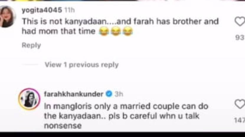 फराह व शिरीश यांच्या लग्नातील या व्हिडीओखाली अनेकांनी कमेंट्स केल्याचं पाहायला मिळतं. यावेळी एका नेटकऱ्याने “हे कन्यादान नाहीये आणि फराहबरोबर त्यावेळी तिची आई आणि भाऊ होता” अशी कमेंट केल्याचं दिसतं. नेटकऱ्याने केलेल्या या कमेंटनंतर फराहने स्वत: कमेंट करत उत्तर दिलं आहे. फराह यावेळी कमेंट करत म्हणाली, “मंगलुरूमध्ये फक्त विवाहित जोडपंच कन्यादान करू शकतात, त्यामुळे उगाच निरर्थक बोलण्यापू्र्वी विचार करा.”