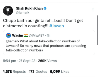 “‘जवान’च्या कमाईचे आकडे खरंच खोटे आहेत का? असंख्य बातम्यांमधून कलेक्शनची खोटी आकडेवारी सांगण्यात येते. यावर तुझं म्हणणं काय आहे? ” नेटकऱ्याच्या या प्रश्नाला उत्तर देत शाहरुख म्हणाला, “गप्प बस…आणि फक्त मोजत राहा! आमची कमाई मोजताना अजिबात लक्ष विचलित करू नकोस.”