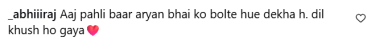“शाहरुख खानसारखाच आवाज”, “तरुण शाहरुख खान”, “वडिलांची ओरिजनल कॉपी”, “आज पहिल्यांदा आर्यनला बोलताना पाहिले, खूप आनंद झाला”, “वडिलांची कार्बन कॉपी”, “सुंदर”, “शाहरुख खानची कॉपी आहे”, “त्याला त्याच्या वडिलांसारखाच तसाच आवाज कसा मिळाला?”, “शाहरुख खानपेक्षा जास्त छान दिसत आहे”, “हा झेरॉक्स नाही, हा तर कार्बन कॉपी आहे”, अशा अनेकविध कमेंट्स पाहायला मिळत आहेत.